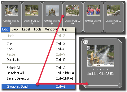 Иногда требуется разместить какую-то группу файлов в одной папке, во избежание путаницы. Теперь от этого можно отказаться, и воспользоваться возможностью объединять выделенные клипы в группу: Edit>Group as Stack (Ctrl + G).