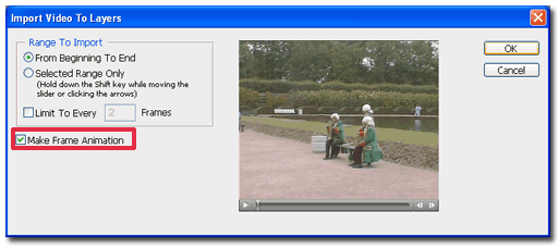В появившемся окне Import Video To Layers отметьте флажками пункты From Beginning To End, Make Frame Animation, и нажмите кнопку OK.