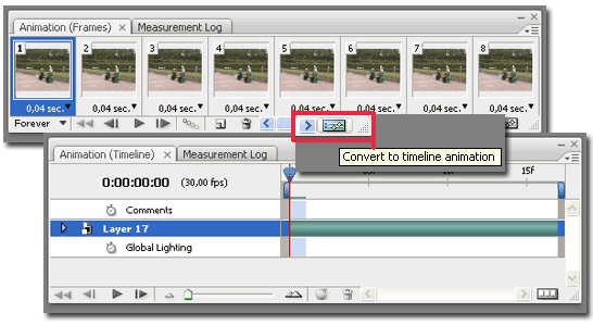 Выполните команду Window>Animation, а для переключения в режим таймлинии нажмите находящуюся в правом нижнем углу кнопку Convert to timeline animation.