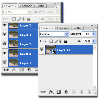 Выделите все слои в палитре Layers (Ctrl+Alt+A), и выполните команду Layer>Smart Objects>Convert to Smart Object. Таким образом, все слои объединились в единую группу, с которой можно работать как с одним слоем.