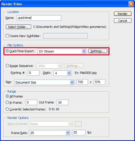 Для просчета и экспорта видео выполните команду File>Export>Render Video. Не забудьте в разделе File Options нажать кнопку Settings, и в открывшемся окне DV Export Settings выбрать настройки DV/PAL/Interlaced/4:3. По окончании всех настроек нажмите кнопку Render.