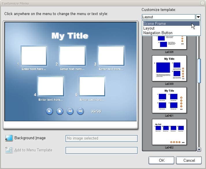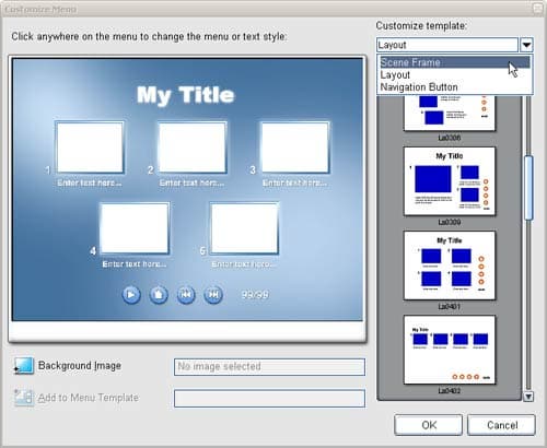 Произведя необходимые действия с видео, по нажатии кнопки "Next>" Мастер переходит ко второй части. Здесь имеется возможность выбрать один из готовых шаблонов меню (всего их 17, разбитых на группы General, Romantic и т.д.), выбрать время проигрывания анимированных кнопок, изменить фон меню, добавить фоновую музыку, а также выбрать наиболее подходящий шаблон размещения кнопок (к сожалению, кнопки и другие объекты нельзя свободно перетаскивать, остается довольствоваться лишь готовыми шаблонами размещения, а их не так и много).