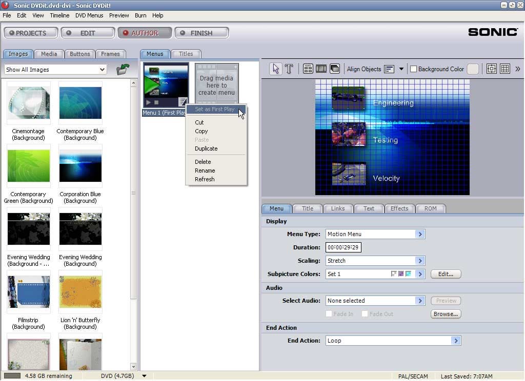 Кроме кнопок, анимировать можно и фон меню. Для этого достаточно из окна проекта при нажатой клавише Alt перетащить любое видео в окно редактирования меню, и фон сменится на выбранный клип.