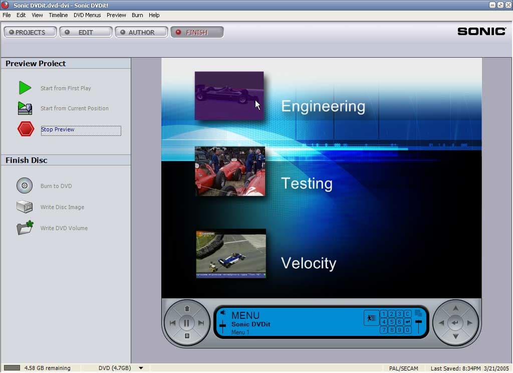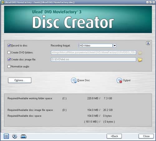 В разделе "Finish Disc" есть возможность выбора действия: прожечь диск, создать образ диска, либо создать папку с файлами DVD. Подготовка файлов к прожигу происходит практически мгновенно (несколько секунд), из чего можно сделать вывод, что необходимые файлы рендерятся программой непосредственно в процессе работы над проектом. Этим же, видимо, объясняется описанная выше медлительность программы (можно быть уверенным, что на достаточно мощных машинах этот недостаток проявляться не будет).
