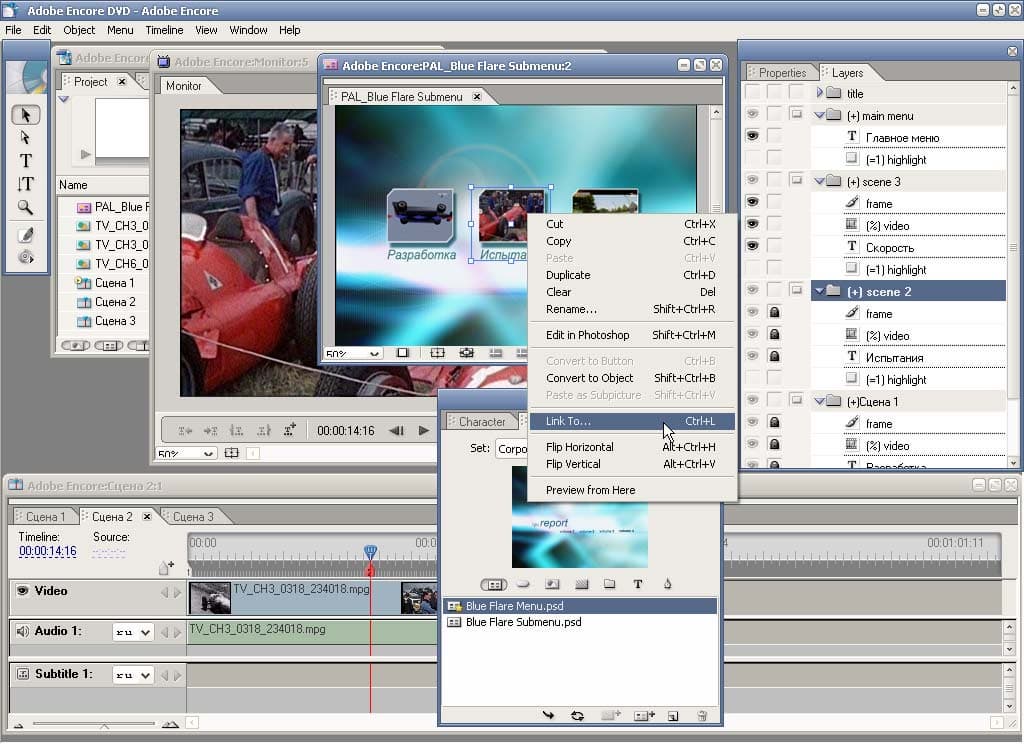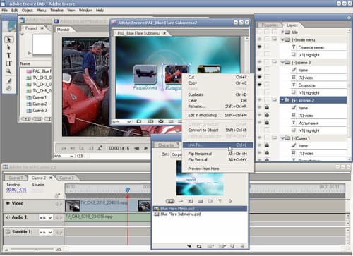 В открывшемся окне редактирования можно добавлять, изменять, удалять объекты и настраивать их параметры. Любой объект можно изменить, воспользовавшись командой "Edit in Photoshop". Однако чтобы изменить текст надписей, совершенно необязательно это делать - достаточно развернуть список слоев, выбрать нужный и, дважды щелкнув по нему, изменить текст так же, как это делается в Photoshop. Если же нажать правой кнопкой мыши на любом из объектов и выбрать пункт "Link To...", то появится возможность выбрать из списка нужный объект, к которому будет совершен переход. Таким объектом может быть как один из клипов проекта, так и любая из заранее размеченных глав. Если в качестве такого объекта выбрать одну из глав любого клипа, то объект примет вид соответствующего видеокадра.
