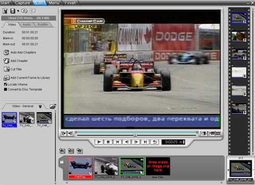 В отличие от Movie Factory переход к различным этапам создания DVD осуществляется закладками, расположенными в левой верхней части рабочей области. В проект можно добавить видео любого формата (продукты от Ulead вообще непритязательны в этом отношении). Также можно воспользоваться модулем захвата видео - почти точной копией аналогичного модуля MovieFactory. Доступны: резка и склейка видеофрагментов, добавление фонового звука, добавление субтитров (с полной поддержкой русского языка), которые можно ввести вручную для любого участка видео, или импортировать из текстового файла. Разбиение видеофрагментов на главы производится как вручную, так и автоматически путем сканирования видео. Следует отметить высокое качество работы модуля сканирования - места смены сцен в видеофрагменте с аналогового источника определяются безукоризненно точно и быстро.