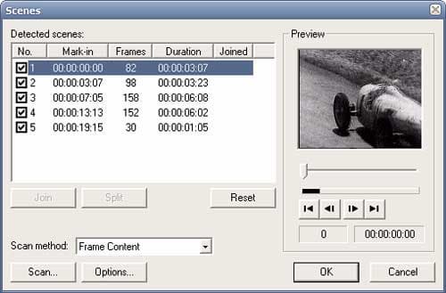 После того, как видео захвачено, либо импортировано в проект (поддерживаемые форматы перечислены ниже), программа автоматически создаст для каждого видеофрагмента анимированный элемент меню. Теперь, выделив любой из них, мы увидим, что появились возможности редактирования: "Edit Video" и "Edit Chapters". Нажатие на кнопку "Edit Video" приводит к появлению окна определения сцен в видеофрагменте, где их положение можно задать вручную или воспользоваться уже знакомым нам методом автоматического сканирования (здесь эта опция называется "Detect Scenes"). Процесс автоматического распознавания сцен происходит медленно и не так скрупулезно точно, как это выполнено в пакете Ulead DVD Workshop. К счастью, неверно определенные сцены впоследствии можно отредактировать, воспользовавшись модулем "Chapter Points", вызываемым кнопкой "Edit Chapters". Завершение разбивки видеофрагмента на сцены производится нажатием кнопки "Add to Storyboard", но на этом редактирование видео не заканчивается, а переходит к следующему этапу: наложению переходов, эффектов и титров.