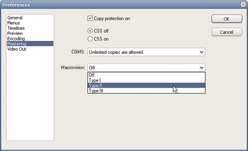 В настройках программы, вызываемых из меню Edit > Preferences (либо сочетанием клавиш Ctrl+K), помимо выбора языка субтитров, формата звука и региона плейера присутствуют и варианты защиты будущего диска (учтите, что последние не работают при использовании обычных рекордеров и болванок “for general use”):