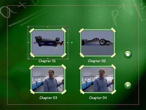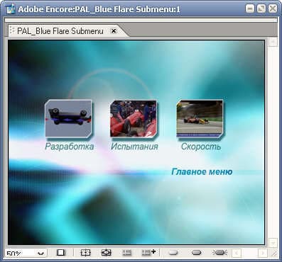 В нашем случае оно может выглядеть следующим образом: перейдя в клип "Разработка", мы увидим не клип целиком, а еще одно меню, при этом оно может иметь иное оформление, нежели главное. В этом вложенном меню анимированные (по желанию) кнопки являются ссылками на Chapters (главы) клипа. И лишь выбрав одну из них, мы перейдем непосредственно к просмотру данной главы. Вернуться в главное меню можно, нажав кнопку "Home" с соответствующей пиктограммой.