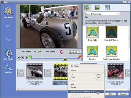 Переходы между сценами (если они вообще нужны) здесь могут добавляться автоматически. Для этого следует использовать команду "Apply random transitions to all" из контекстного меню. При этом между всеми сценами появятся случайно выбранные программой переходы. Их количество и качество вполне удовлетворяет требованиям, предъявляемым к любительскому видео.