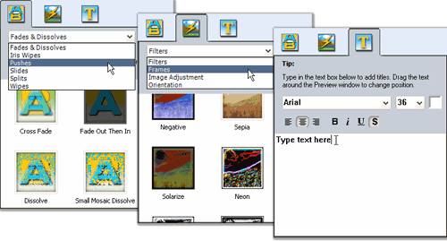 Данное окно содержит три вкладки: наложение переходов, наложение видеофильтров и добавление текста (русский язык поддерживается):