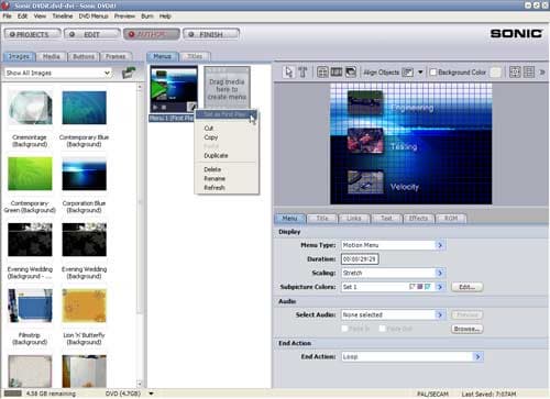 Количество и оформление вложенных меню, количество звуковых дорожек, дорожек субтитров определяет пользователь. Sonic ReelDVD - это настоящий конструктор, детали к которому пусть и приходится изготовлять самому, зато ни их количество, ни качество не ограничено возможностями программы.