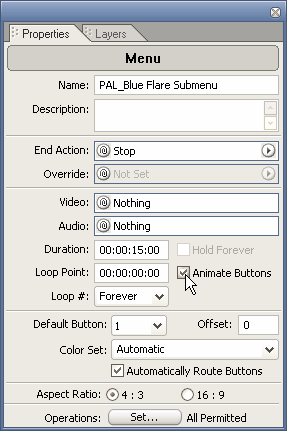 В Adobe Encore можно создавать не только статичные меню, но и анимированные. Для этого в окне проекта необходимо выделить текущее меню, и на вкладке свойств выставить флажок "Animate Buttons" (Анимировать кнопки). Кроме того, на этой же вкладке можно определить время проигрывания клипа, количество проигрываний и другие параметры.