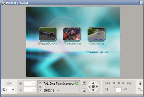 , она приобретет зеленый цвет и монитор перейдет в режим просмотра проекта. Здесь, используя стандартные кнопки управления плейером, можно просмотреть, как будет вести себя готовый DVD.