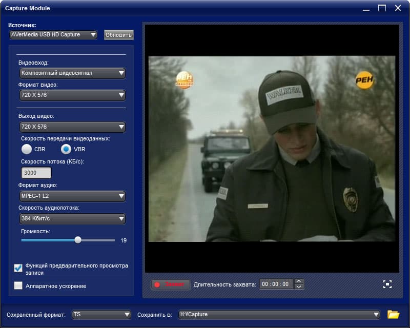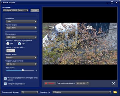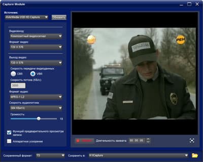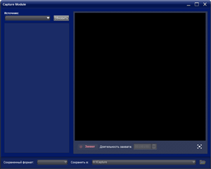 Просмотр и захват видео, поступающего в устройство, производится в окне Capture Module программного пакета ArcSoft Total Media Extreme.