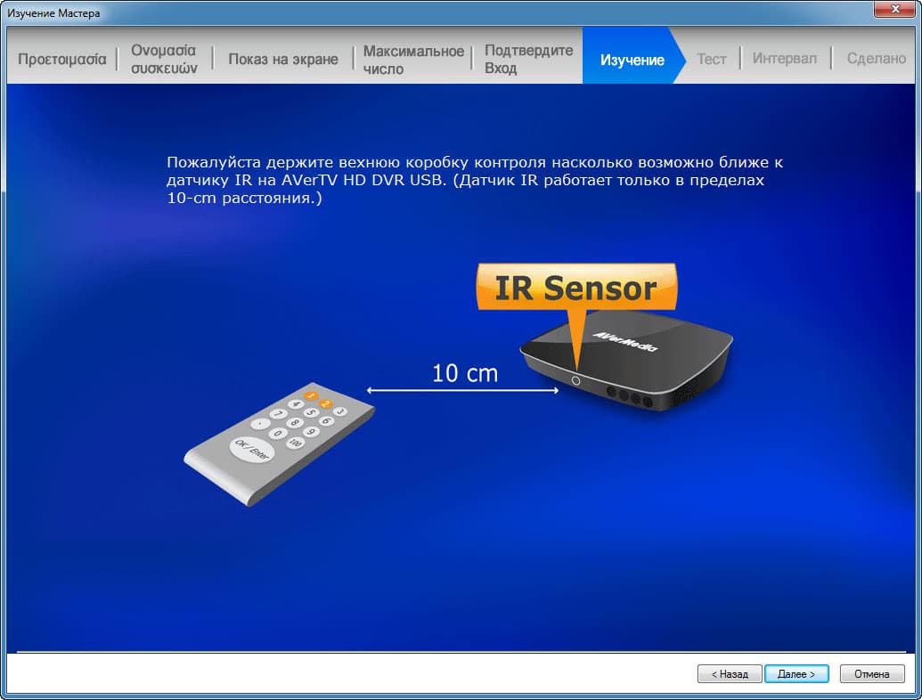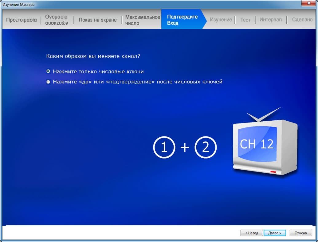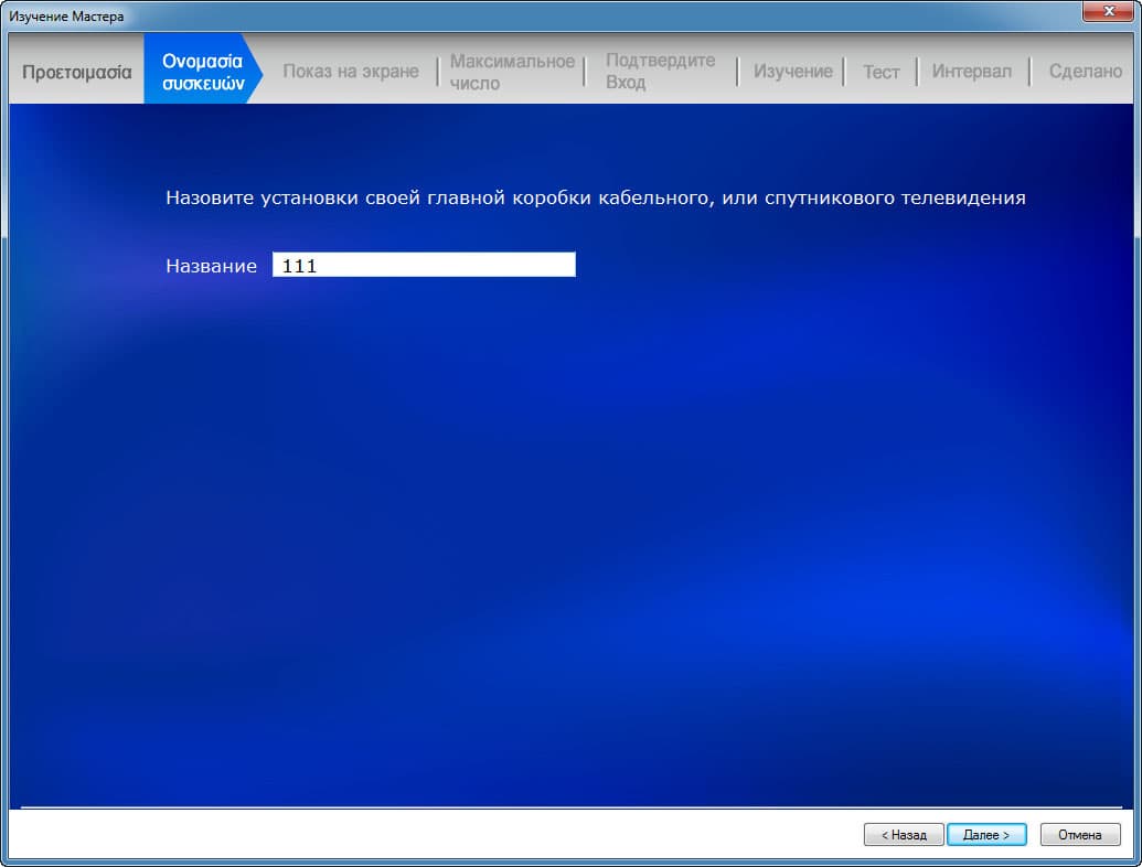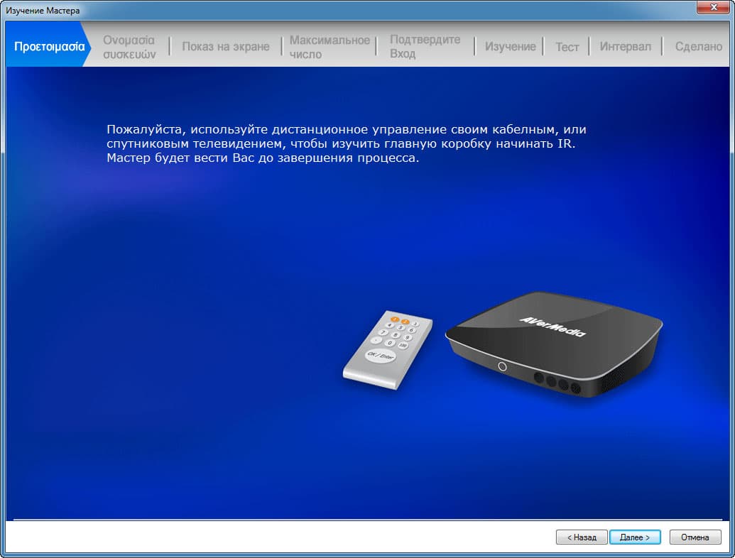 Чтобы такой фокус удался, наше устройство следует прежде всего обучить командам, которые подаёт пульт телеприставки (для этого обучения на передней панели устройства имеется инфракрасный датчик). Процесс обучения проводится в step-by-step мастере, чей интерфейс переведён с явной поспешностью. Впрочем, несмотря на promt-овский перевод, понять происходящее несложно.