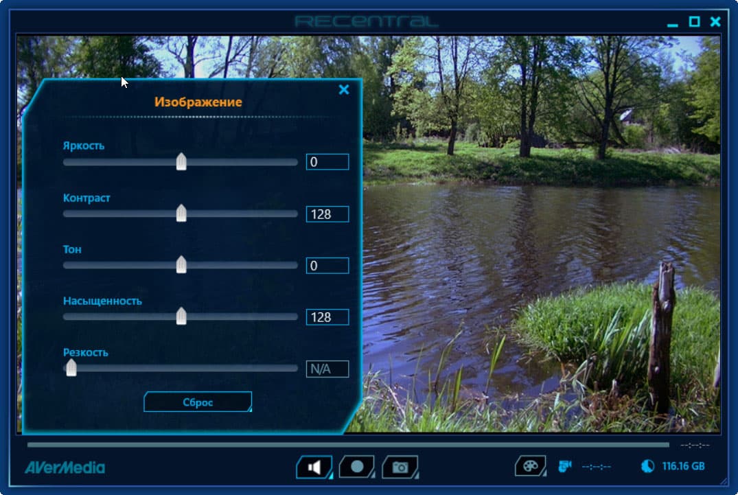 Также здесь имеются настройки изображения — яркость, контраст, тональность, насыщенность и резкость.