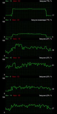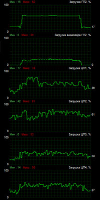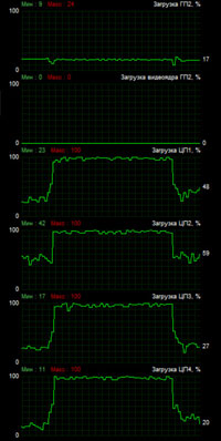 График слева ясно указывает, что при отключенном аппаратном ускорении центральный процессор ноутбука во время захвата и сжатия в MP4 работает во всю силу — загрузка держится почти под 100%. Графический же процессор в это время простаивает, выдавая лишь короткие всплески активности в момент старта и остановки захвата. Взглянув на график справа, мы видим обратную картину — графический процессор во время захвата загружается до 62%, при этом ЦП нагружается пусть и хаотично, однако в среднем лишь до 70%. Так вот зачем в системных требованиях, которые можно считать рекомендациями, так настойчиво упоминается видеокарта Nvidia! Это же работает знакомая нам архитектура CUDA! Очень, очень радует, что разработчики AverMedia сумели подключить к работе данную технологию, которая значительно снижает нагрузку с центрального процессора, позволяя тому заниматься какими-то другими делами. Ведь не исключены случаи, когда компьютер или ноутбук одновременно с захватом должен заниматься еще и трансляцией видео. А для этого центральному процессору так или иначе требуются свободные ресурсы, пусть небольшие, но тем не менее.