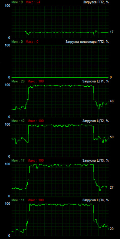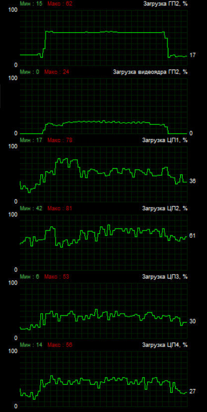 В первую очередь убедимся, действительно ли при захвате включается какое-то аппаратное ускорение. Если включается, то за счет чего происходит эта акселерация? Проведем последовательный захват в Adobe Premiere Pro, сначала с отключенным ускорением, а затем — с включенным. При этом станем анализировать состояние центрального и графического процессоров ноутбука. Вот и результаты: