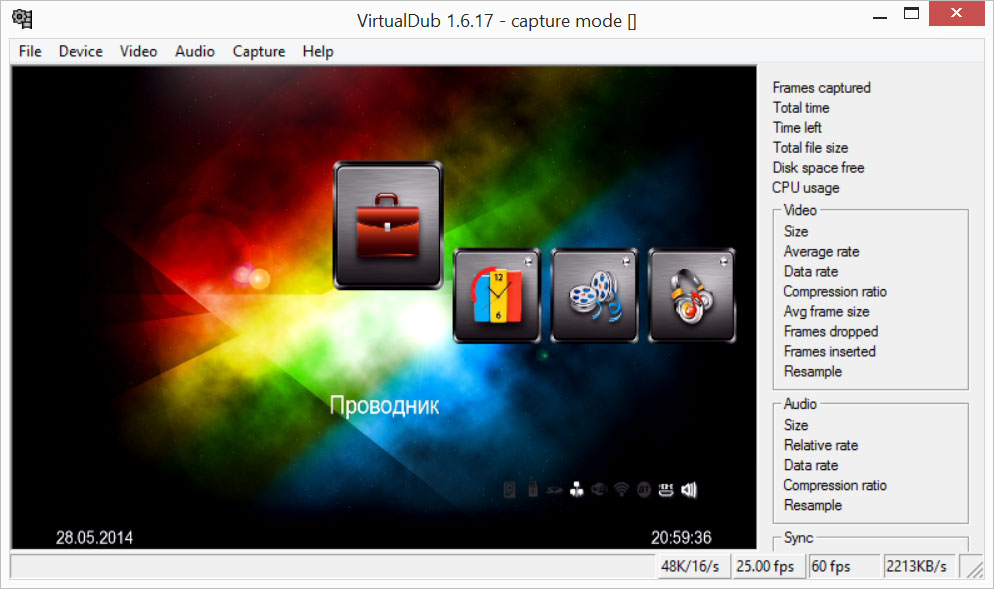 Что дальше с этим сигналом делать — целиком задача пользователя. Хочешь — транслируй своими путями и методами вплоть до самописного софта, хочешь — захватывай в какой угодно формат, в зависимости от установленных в системе кодеков. Признаться, мы попробовали было произвести захват в несжатое видео, но не тут-то было — дисковой скорости ноутбука не хватает для записи «сырого» Full HD-сигнала с частотой 50 кадров в секунду. В результате захват производится с пропусками кадров, их выпадениями. И немудрено — элементарный подсчет показывает, что для захвата несжатого видео требуется иметь как минимум SSD, обеспечивающий скорость записи 300 мегабайт в секунду (один несжатый кадр «весит» 6 мегабайт; умножив их на 50, получим требуемую скорость).