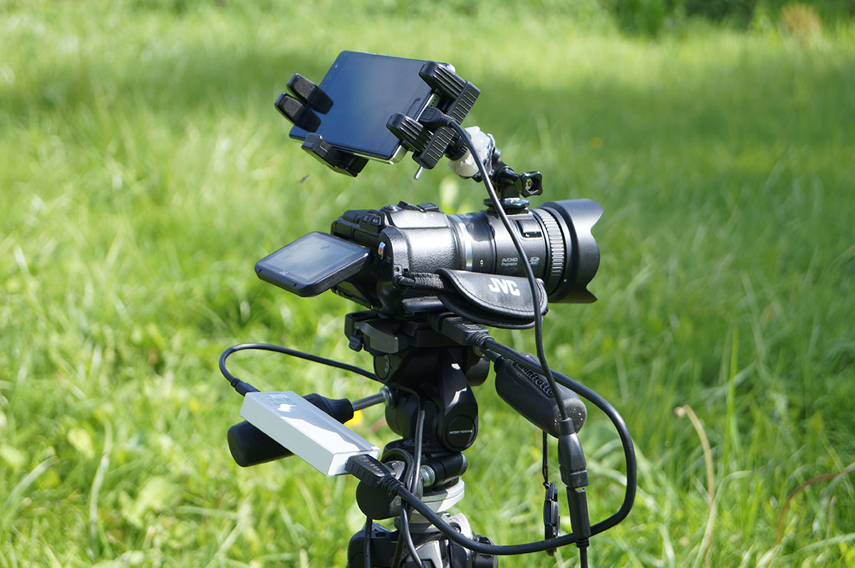 Однако с помощью рассматриваемого устройства вполне можно избежать ненужных и дорогостоящих трат на оборудование, его перемещение и обслуживание. Достаточно подключить любую камеру с HDMI выходом — и трансляция возможна с помощью любого смартфона. Который в данном случае будет выступать только в качестве передаточной радиоточки и батарейки, от которой питается устройство захвата. Вот так может выглядеть передвижная, абсолютно мобильная, станция телевещания или видеостримов: камера, устройство захвата и смартфон. Который в данном случае выполняет еще одну функцию — это большой дисплей-видоискатель.