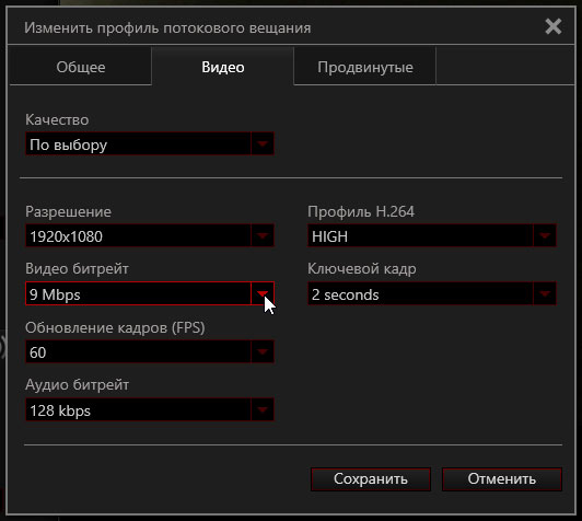 Для трансляции также существуют свои настройки. По сути они отличаются от настроек локальной записи лишь максимальным уровнем битрейта. Так, для размера кадра 1920×1080 и частотой 60p максимальным битрейтом является цифра 9 Мбит/с.