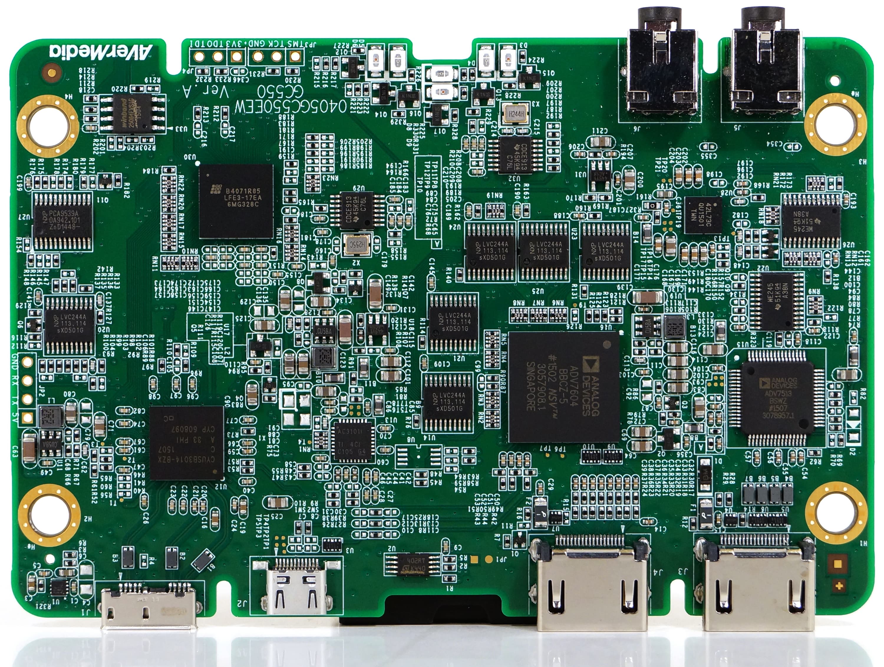 На печатной плате внимание привлекает основной компонент устройства, старый знакомый — микросхема ADV7604 с мультиформатным видеодекодером и поддержкой HDMI версии 1.3. Этот чип уже применялся в таких устройствах захвата AverMedia, как ExtremeCap 910 и ExtremeCap U3. Данные аппараты также имеют внешний формфактор, и забирают питание по шине USB.