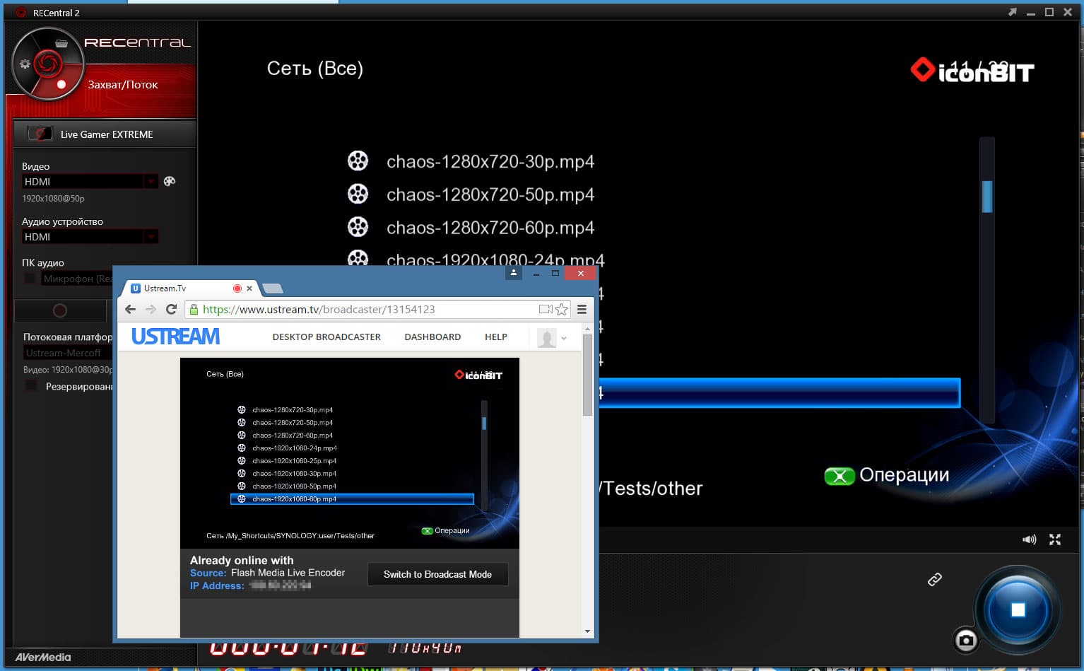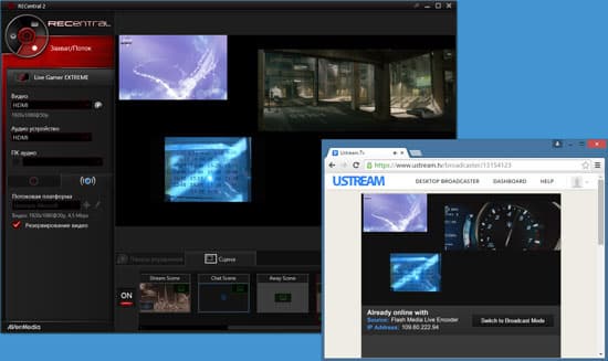 Уточним еще раз — такое количество доступных в программе сервисов имелось на момент написания статьи. Описывать в подробностях процесс регистрации на одном из указанных сервисов и последующий ввод пары логин/пароль в программу вряд ли имеет смысл, это элементарно. Достаточно будет сказать о задержке вещания, которая происходит, к примеру, при трансляции живого видео на Ustream: в нашем случае такая задержка составила 6 секунд. Да, не поиграешь, глядя в окошко браузера. Ну так ведь трансляция предназначена совсем для другого.