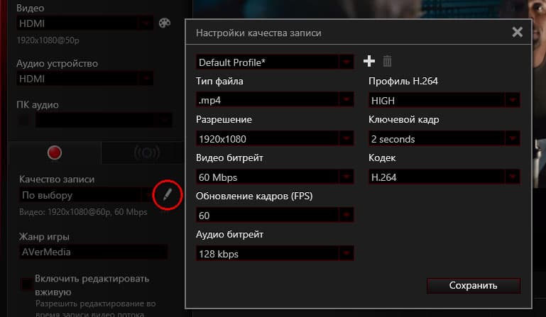Помимо этого элементарного выбора, здесь же, в боковой панели, имеется возможность настройки качества записи. Оно определяется не только размерами и частотой кадров и битрейтом, но и также профилем кодека H.264, что является довольно важным параметром. Лучше бы, конечно, оставить как есть по умолчанию, наивысший профиль High.