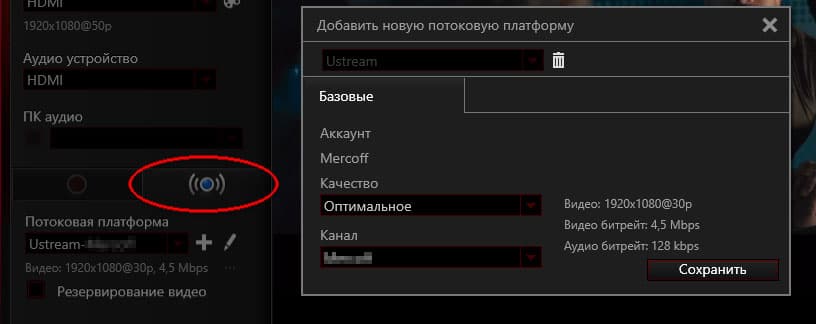 Но пора вспомнить о том, что рассматриваемая карта захвата — а точнее, ее программная составляющая — умеет осуществлять прямую видеотрансляцию на несколько популярных веб-сервисов. Для того, чтобы активировать данную возможность, следует переключиться на вкладку Поток. Здесь в выпадающем списке отображаются все занесенные в программу учетные записи пользователя. В данном случае — это Ustream.
