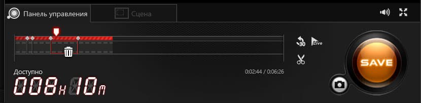 Говоря по-простому, данный пункт активирует так называемый тайм-шифтинг, то есть, постоянную фоновую запись с возможностью быстрой перемотки в любое место записи. Но это если совсем уж по-простому. На самом же деле в данном приложении все гораздо глубже и интереснее — это практически функция настоящего линейного монтажа, который производится в реальном времени. Иначе — вживую. Так и есть — непосредственно во время фоновой видеозаписи пользователь может не только просматривать уже записанный материал (который в это время продолжает пополняться новым материалом), но и расставлять контрольные точки, которыми отмечаются нужные либо ненужные участки с последующим их удалением или сохранением. Все операции производятся мышкой, а наглядные иконки не дадут запутаться даже дилетанту.