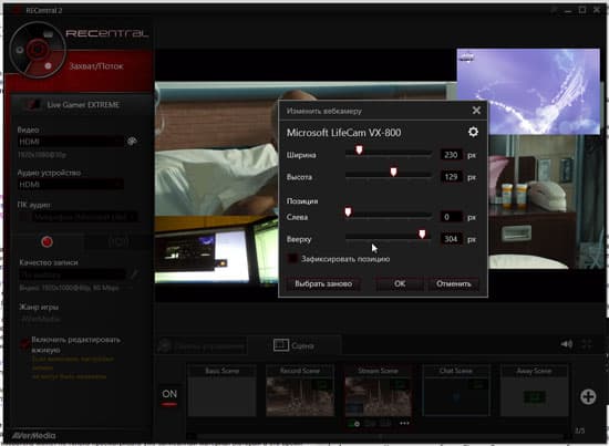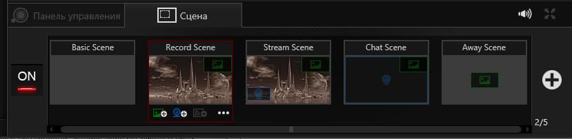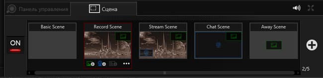 Тут требуется произнести зашарканную до невозможности рекламную фразу: но и это еще не все! Перейдя на вкладку Сцена, пользователь увидит несколько шаблонов, позволяющих по-разному оформить записываемый материал. Каждый шаблон относится к разным категориям видеозаписей, включая такие, как чат или стриминг.