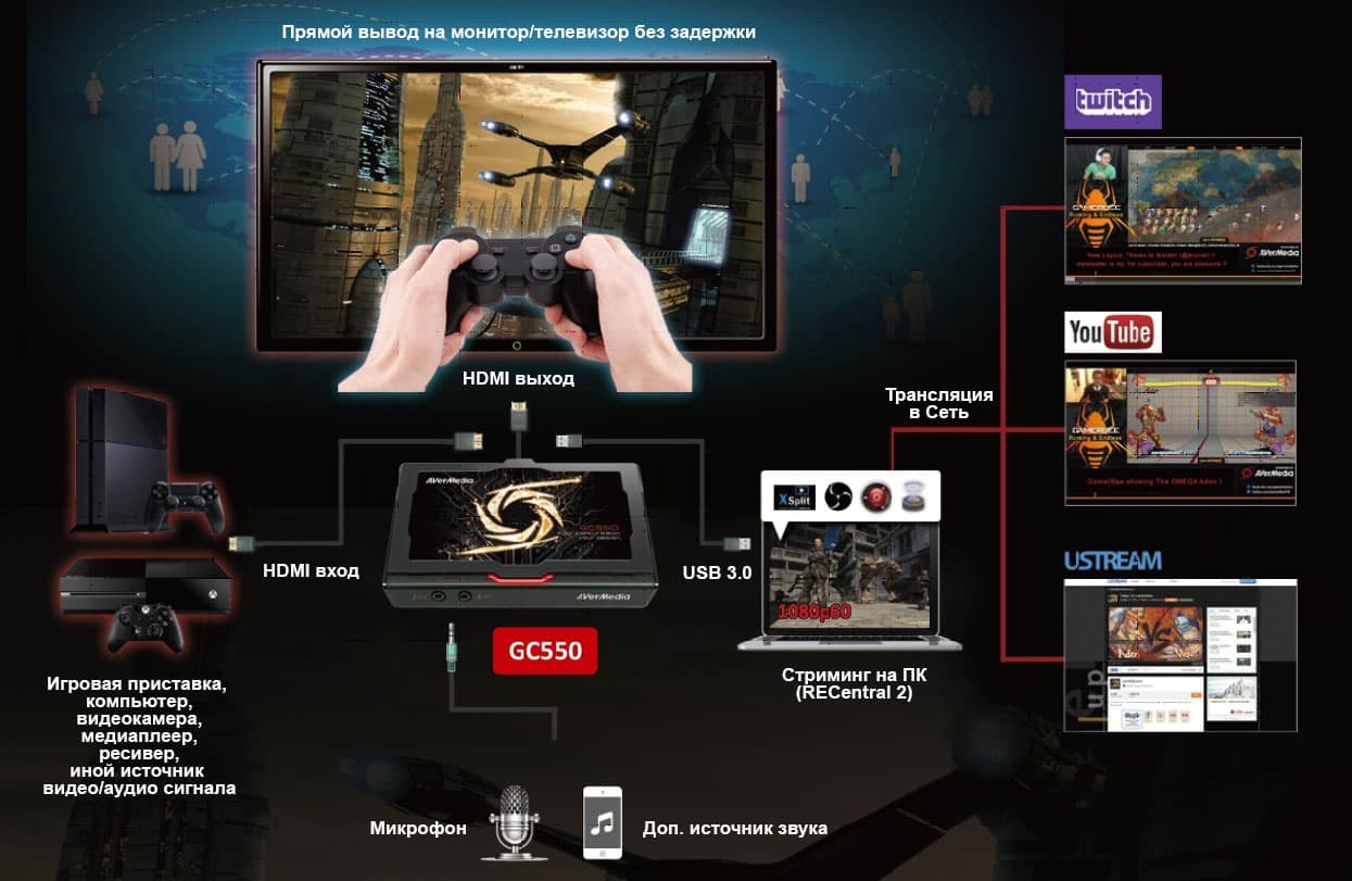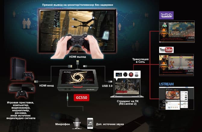 Лучше всего будет привести схему способов подключения и эксплуатации устройства, которая наглядно иллюстрирует все возможные варианты коммуникации. Ну, почти все. Потому, что программное обеспечение не ограничивается живой трансляций (стримингом) лишь на эти три веб-сервиса.