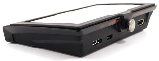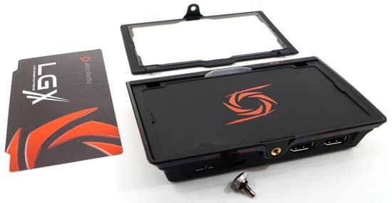 Корпус устройства изготовлен из шероховатого черного пластика с небольшим количеством черных глянцевых вставок. Своеобразный угловатый дизайн характерен для игровых продуктов AverMedia, как и черно-красная расцветка. Трапециевидная светлая полоска, находящаяся на стыке лицевой панели и крышки — это двухцветный светодиодный индикатор, который своими перемигиваниями сигнализирует о текущем состоянии устройства. Есть тут и еще одна характерная для продуктов компании деталь — некая изюминка, которая не имеет непосредственного отношения к функциональности, но, тем не менее, увеличивает привлекательность в геймерском мире. Видите прозрачное окно с рисунком под «стеклом»? Это она и есть, деталь. Чуть ниже мы расскажем о ней.