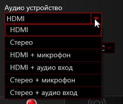 Как видим, в левой части главного программного окна расположена панель управления, где производится выбор источника видео- и аудиосигнала, а также осуществляется настройка качества записи. Тут нас и поджидает серьезное разочарование в пункте Аудио устройство. Ну, пусть не разочарование, но по крайней мере небольшое охлаждение пыла.