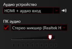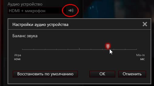 Ну а собственно соотношение уровней аудиосигналов, поступающих на карту захвата, выбирается в небольшом всплывающем окошке непосредственно в главном окне захвата, которое появляется при нажатии на иконку динамика. Здесь, как можно видеть, имеется возможность усилить уровень одного сигнала, одновременно уменьшив уровень другого. Например, чем ближе ползунок находится к положению Mix-in, тем ниже будет уровень звука фильма (Игра), но выше уровень источника, поступающего на отдельные аудиовходы карты захвата.