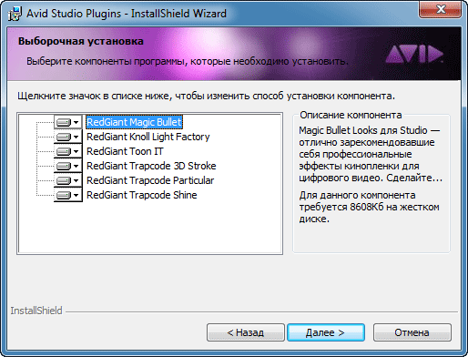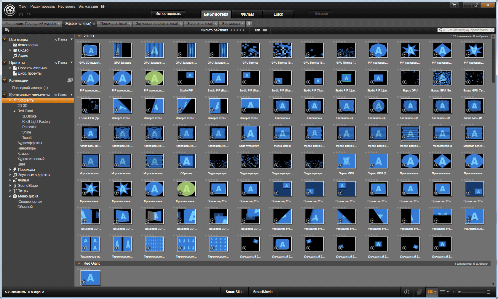 В пакет входит набор плагинов компании RedGiant — и снова вспоминается Pinnacle Studio, традиционно имеющая в составе подобные творения сторонних разработчиков.