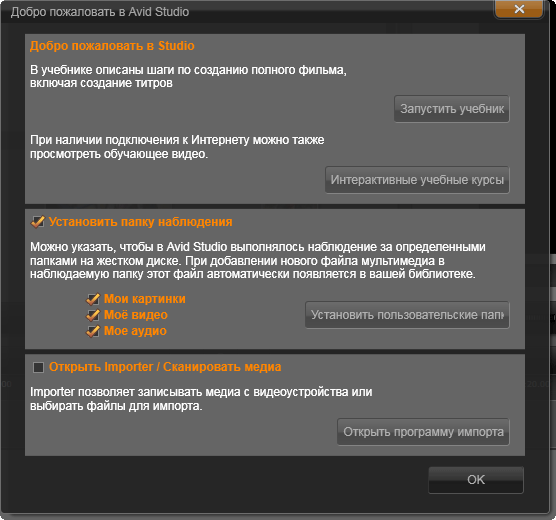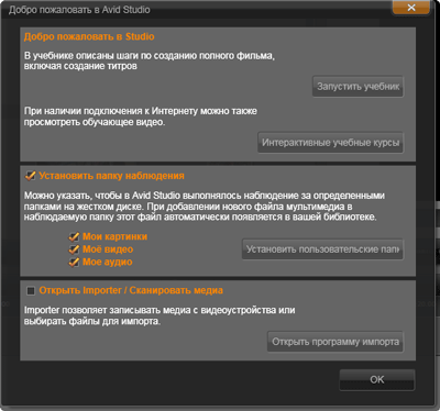 При первом запуске программы пользователя встретит приветственное окно с предложениями начать обучение работе в редакторе и выбрать папку на жёстком диске, содержимое которой всегда будет доступным в библиотеке Avid Studio без лишних временных затрат на импорт.