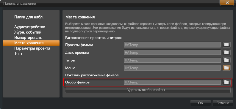 Настройки программы вызываются командой меню Настроить → Панель управления либо сочетанием клавиш Ctrl+Alt+C. Здесь мало интересных параметров, за исключением двух важных. Первый из них скрывается в пункте Места хранения. Сначала пользователю рекомендуется определить папку для временных файлов (и пусть вас не смущает перевод названия этой папки — Отобр. файлов). В ней создаются и хранятся все временные файлы, которые программа создаёт во время работы. А следовательно, папка эта должна располагаться на свободном скоростном диске. Впрочем, данное правило относится не только к рассматриваемой программе, а ко всему нелинейному видеомонтажу в целом.