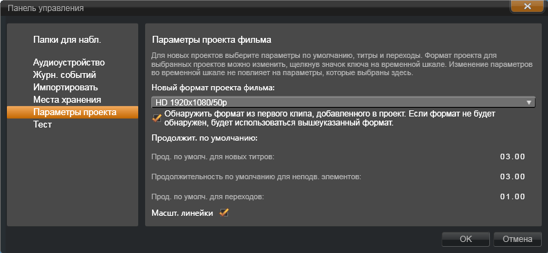 Второй важный параметр — установка формата проекта по умолчанию (пункт Параметры проекта). В выпадающем списке имеется два десятка наиболее распространённых стандартов, из которого требуется выбрать тот, с которым вы чаще всего работаете. Хотя можно обойтись и без этого, только не забудьте отметить флажком пункт «Обнаружить формат из первого клипа…». Если данный флажок выставлен, то программа автоматически создаст проект с параметрами, соответствующими первому импортированному клипу.