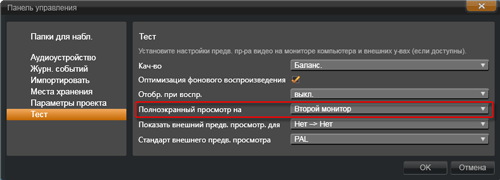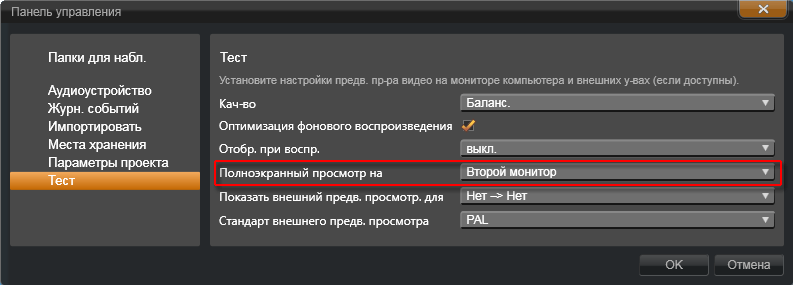 Наконец, в самом последнем пункте — Тест — пользователю предоставляется возможность настроить качество отображаемого контента, а также, что наиболее важно, вывести окно предпросмотра на второй монитор. Как мы увидим в дальнейшем, это может оказаться необходимым условием для полноценного монтажа.
