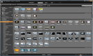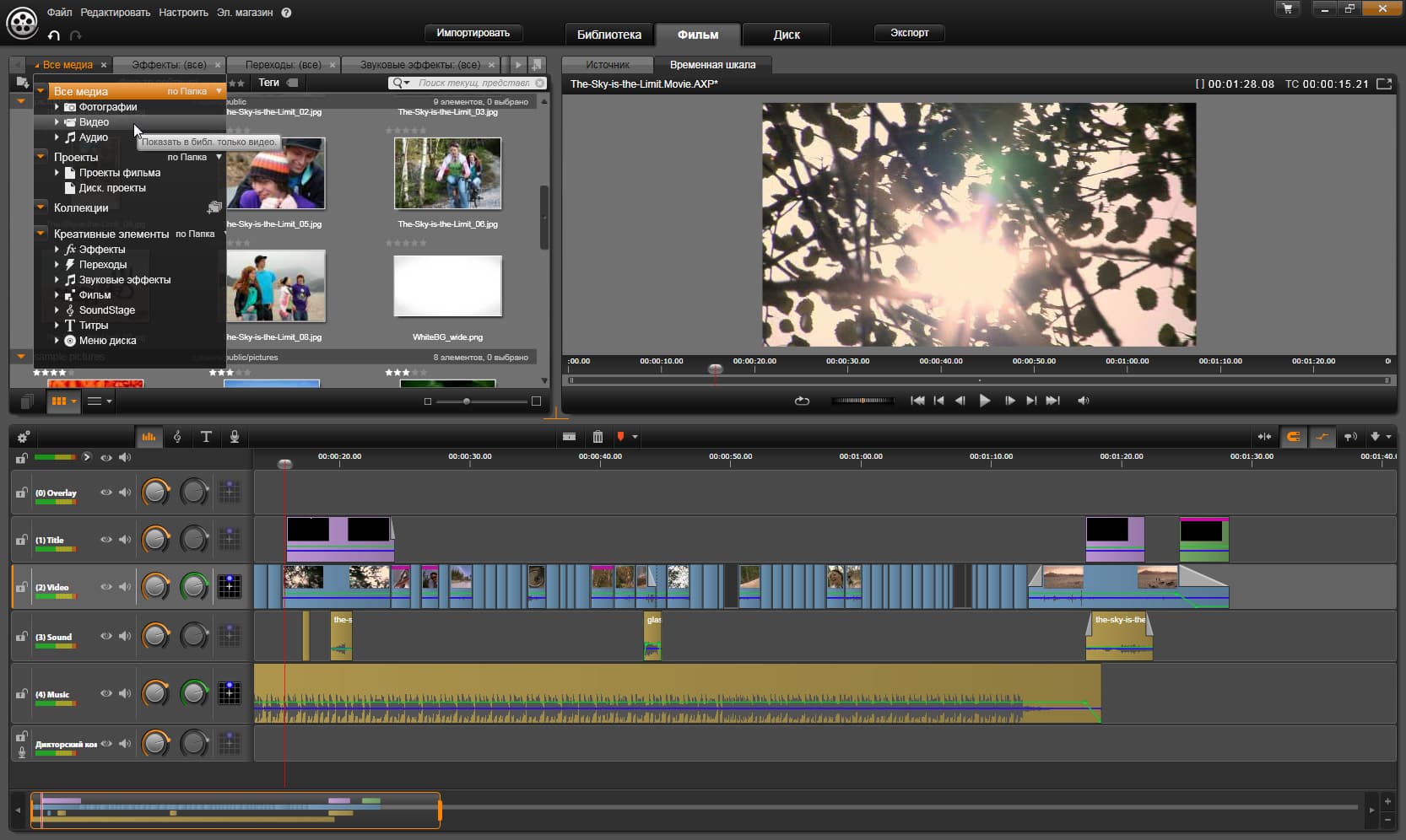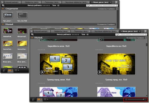 Окно материалов находится в левой верхней части программного окна, тип отображаемого медиа выбирается вкладками: Коллекции, Эффекты, Переходы, Звуковые эффекты, Меню диска. Отображение медиаматериала довольно удобно, присутствует как сортировка по типу файла, так и быстрый поиск, позволяющий разыскать нужный клип или фотографию. Материал может отображаться в табличном виде или пиктограммами, размер которых изменяется с помощью ползунка.