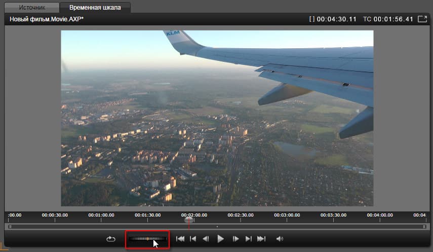 Окно предпросмотра находится справа вверху, здесь имеются все необходимые для просмотра инструменты: покадровая прокрутка, колесо скраббинга, вариативно изменяющее скорость воспроизведения.