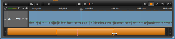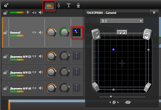 Следующие кнопки, расположенные чуть правее, тоже не для красоты сделаны. Первая из этих кнопок включает отображение на таймлинии дополнительных инструментов, предназначенных для работы с аудио: два регулятора громкости (общая громкость и громкость в текущем положении клипа) и кнопку вызова модуля регулировки объёмного звука (Панорама). Если звук в клипе пятиканальный, то пользователь будет иметь возможность произвести сдвиг в любую сторону.