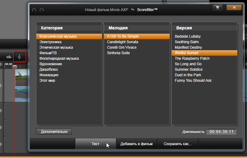 Следующая кнопка с пиктограммой скрипичного ключа открывает модуль Scorefilter. Эта аудиобиблиотека позволяет подобрать нужное музыкальное сопровождение произвольной длительности и добавить его в проект. Жаль только, что в комплекте по умолчанию отсутствует детская тема… Впрочем, для того здесь и существует кнопка Дополнительно. Её нажатие приведёт вас прямёхонько в Электронный магазин Avid, где можно найти и приобрести недостающие материалы.