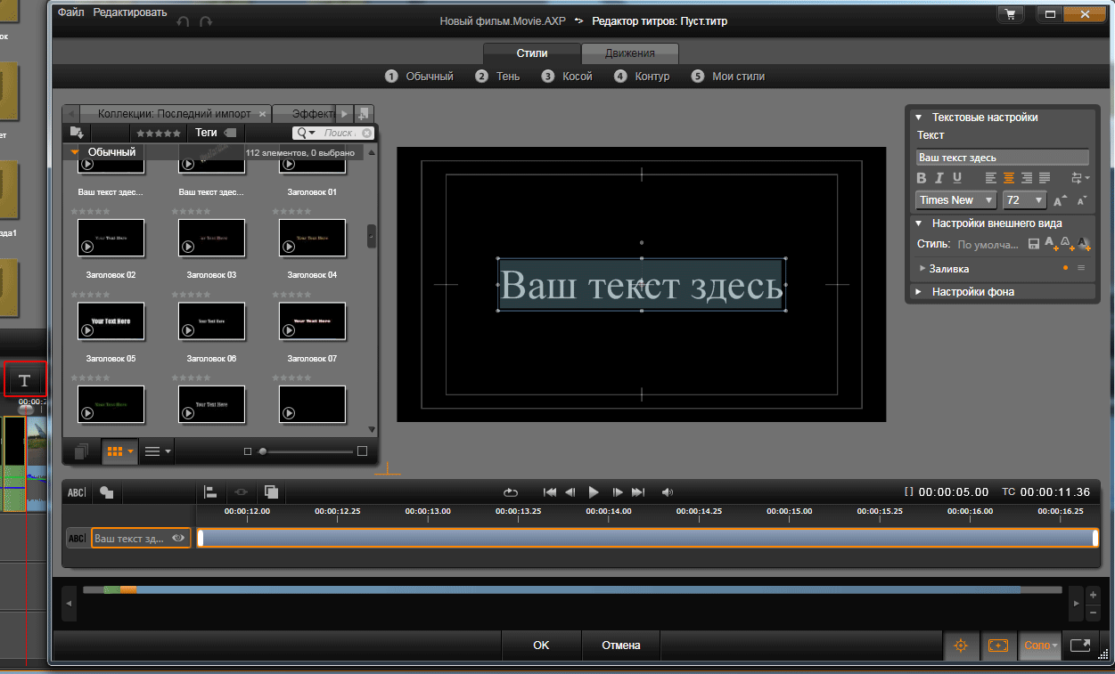 За скрипичным ключом следует всем понятная кнопка, запускающая модуль создания титров. Его возможности довольно богаты, а количества и качества присутствующих здесь шаблонов оформления и анимации хватит любому пользователю, даже самому взыскательному шедевромейкеру.
