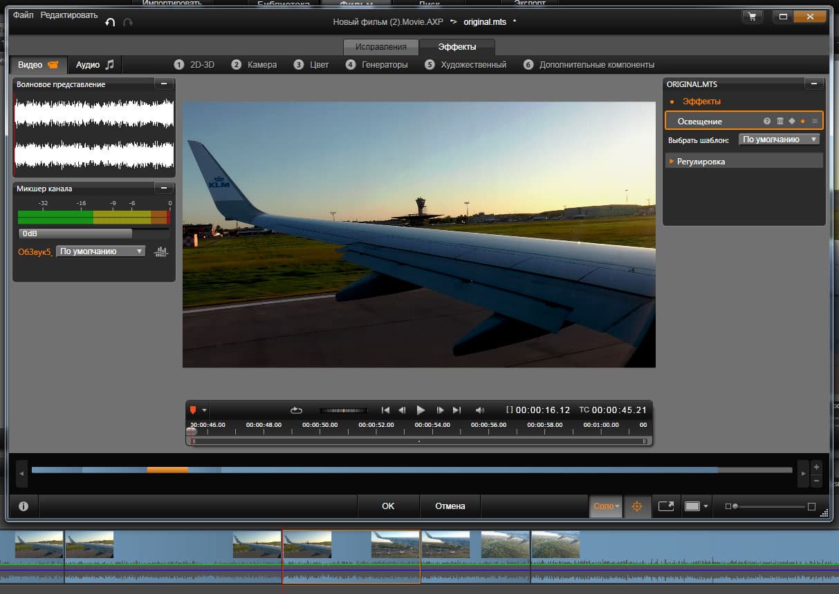 В данном окне можно найти все без исключения фильтры и эффекты, присутствующие в программе. Точные их настройки производятся здесь же, в правой части окна модуля. Кстати, в данном же модуле редактирования эффектов можно отыскать и столь необходимый фильтр, как стабилизация видео. Следует заметить — просчёт стабилизации работает чрезвычайно медленно. HD-ролик длительностью около одной минуты обрабатывался полчаса. Загрузка процессора при этом невелика: все ядра Intel Core i7 во время работы задействовались едва ли наполовину.