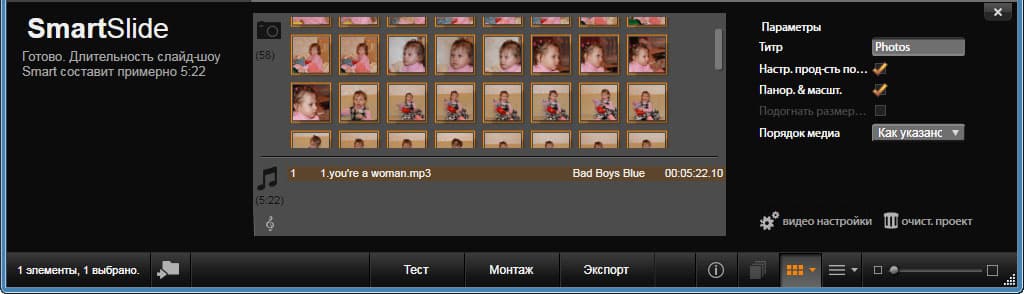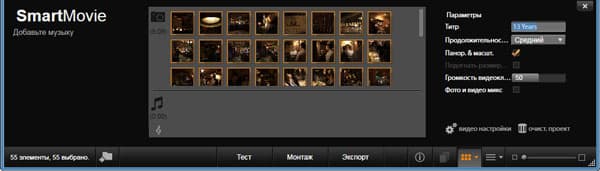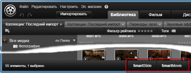 Первый из них, SmartSlide, предназначен для создания слайд-шоу из фотографий с музыкальным сопровождением. Второй, SmartMovie, автоматически генерирует видеоклипы. Оба перечисленных модуля запускаются одноимёнными кнопками, расположенными в нижней части Библиотеки.