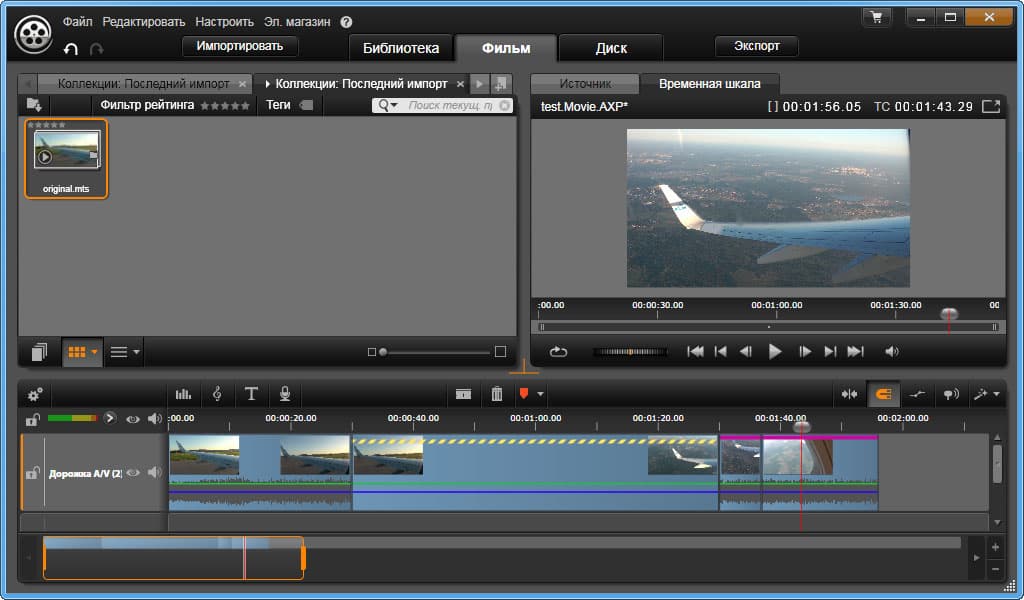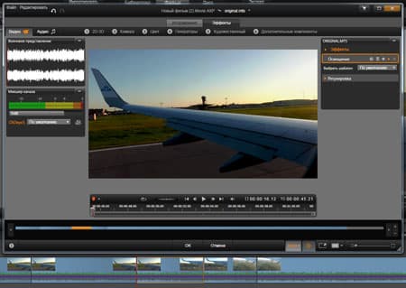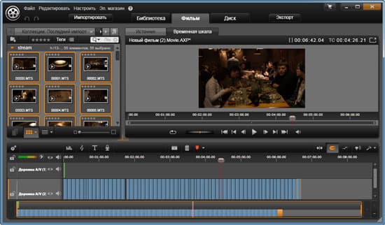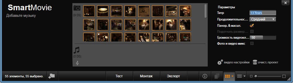 Автомонтаж видеоролика также несложен. Минутная работа с простейшими настройками, и можно переходить к следующему шагу: просмотру получившегося ролика, продолжению его монтажа на таймлинии «вручную» или, наконец, к экспорту получившегося фильма на диск или в файл.