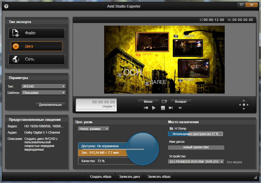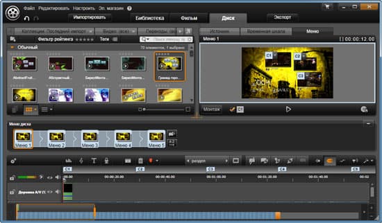 Перейдём к заключительным этапам работы с видео: экспорт в готовый файл и авторинг диска (в отличие от большинства «серьёзных» видеоредакторов, Avid Studio предоставляет также возможность авторинга). Вкладка Диск — и в распоряжении пользователя поступает несложный авторинга диска, состоящий из всех минимально необходимых инструментов.
